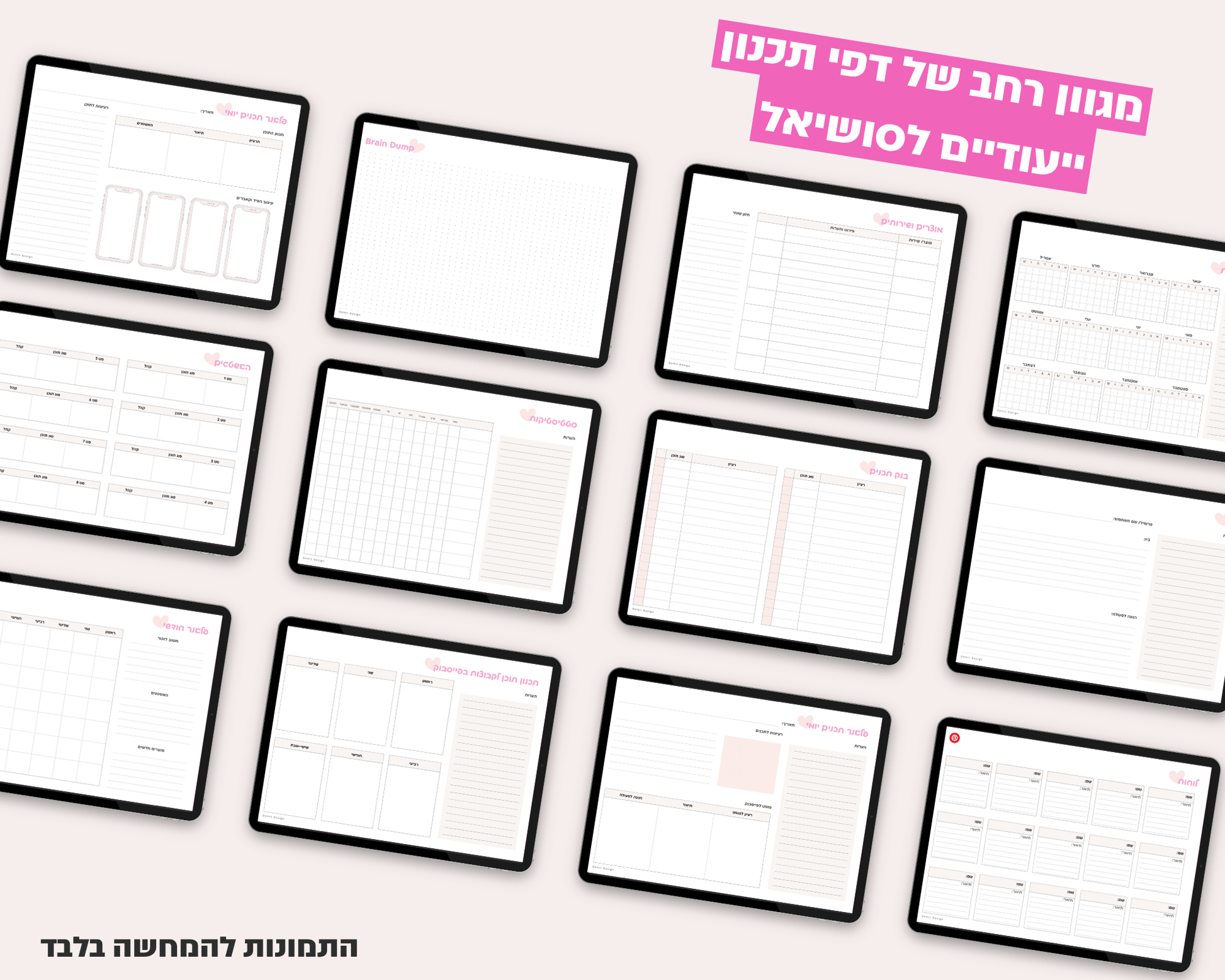 הפלאנר כולל מגוון דפי עבודה ממוקדים, שעוצבו במיוחד כדי לעזור לכן לתכנן, לרשום, לעקוב ולהוציא לפועל את כל מה שקשור לסושיאל: