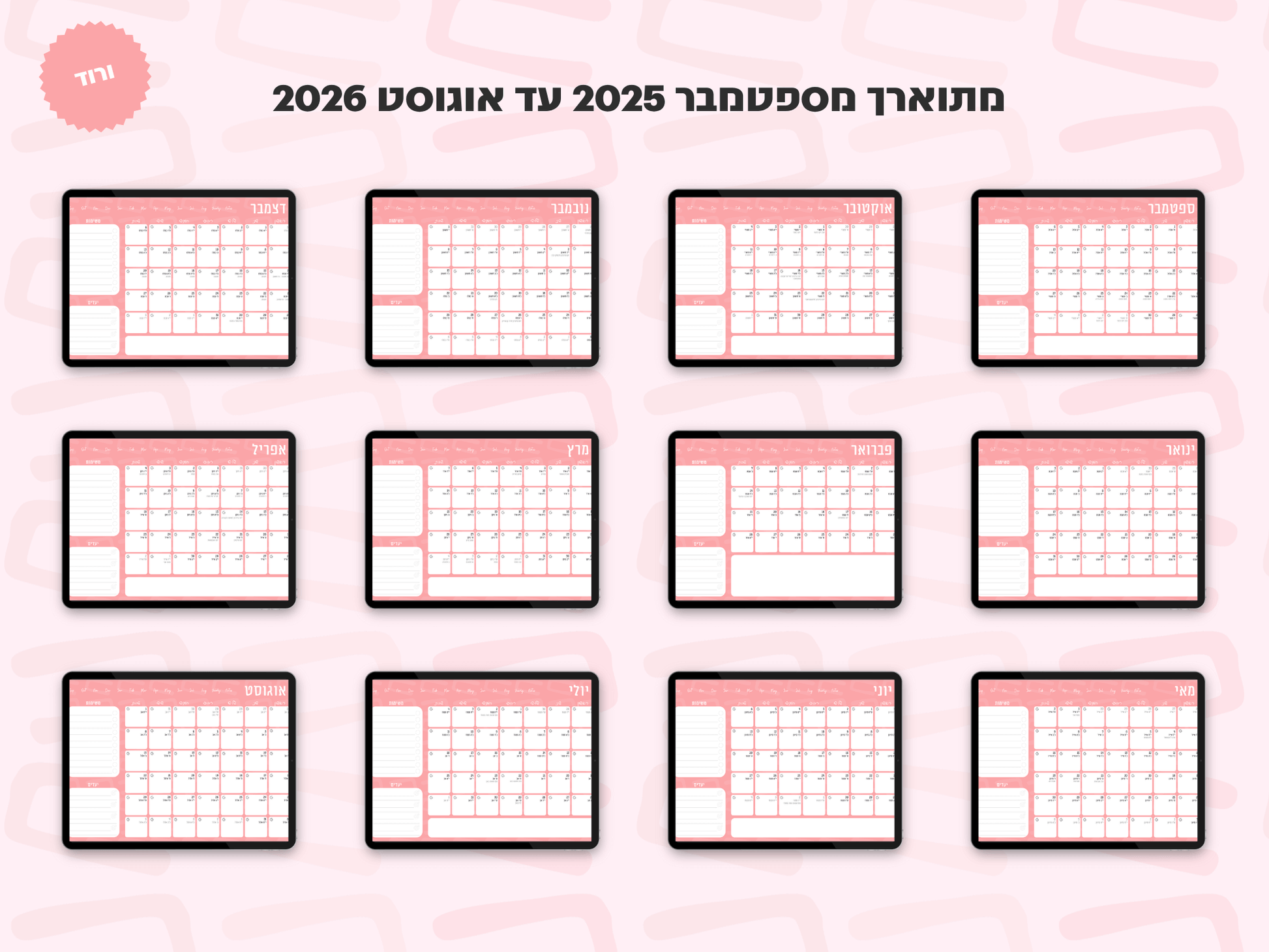 הפלאנר מתוארך מספטמבר 2025 ועד אוגוסט 2026, ומאפשר לך תכנון חודשי קבוע ל־12 חודשים קדימה.